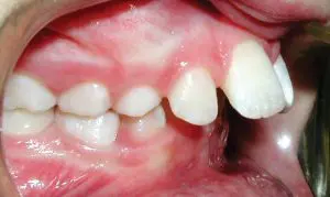 The upper teeth sit inside the lower teeth, which may cause tooth stratification and misaligned jaw growth.